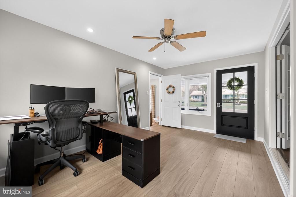 Welcome to this charming ranch home in Penn Valley Manor, located in Lower Makefield Township and the highly desirable Pennsbury School District. Offering the ease and convenience of one-story living, this home features a bright, comfortable layout and a private fenced backyard. Step inside to a sun-filled family room highlighted by a beautiful bay window that brings in an abundance of natural light. Hardwood floors and recessed lighting add warmth and character, creating an inviting space for everyday living, relaxing, or gathering with family and friends. The kitchen features wood cabinetry, recessed lighting, and a functional layout that flows seamlessly into the dining area. Just off the kitchen, the dining room provides a great setting for both casual meals and entertaining, with sliding glass doors that lead to the backyard patio — perfect for enjoying morning coffee, summer dinners, or easy indoor-outdoor living. The main bedroom is nicely sized and offers a comfortable retreat, while two additional bedrooms provide flexibility for guests, hobbies, or a playroom. A separate room with French doors is currently used as a home office, offering a bright and quiet workspace. The renovated full bathroom includes a tub/shower combination, tile flooring, quartz vanity, and convenient linen storage. The unfinished basement provides ample storage and additional flexible space, with the washer and dryer located on this level. Outside, the fenced backyard with patio offers a private setting for relaxing, entertaining, or gardening. A driveway accommodates multiple vehicles. Recent updates include a roof replaced in 2020, new exterior siding in 2024, brand new water heater, updated plumbing, electric and HVAC with central air, and most windows replaced. Conveniently located near downtown Yardley, the Delaware Canal towpath, local dining, train stations, and major commuting routes including I-95, I-295, Route 1, and the PA Turnpike, this home combines comfortable one-floor living with an exceptional Lower Makefield location within the Pennsbury School District.